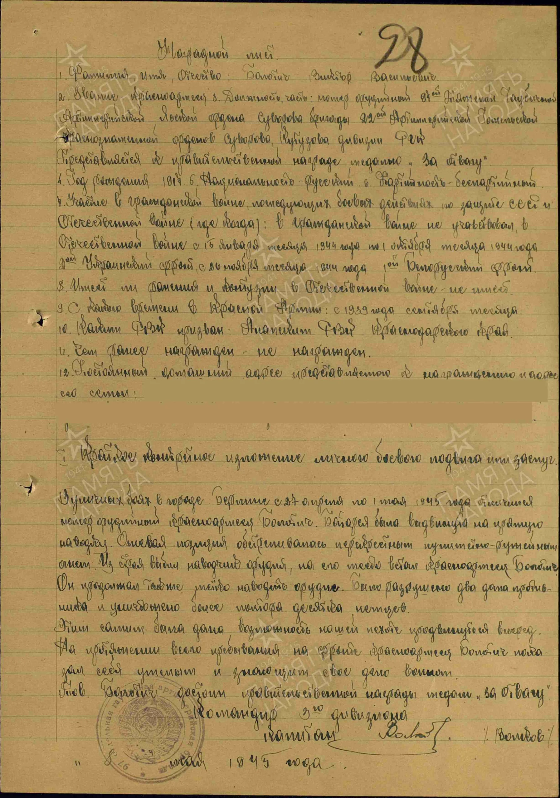 «В уличных боях за Берлин с 27 апреля по 1 мая 1945 г. отличился номер орудийный красноармеец Болотич. Батарея была выдвинута на прямую наводку. Огневая позиция обстреливалась перекрестным пулеметно-ружейным огнем. Из строя выбыл наводчик орудия, на его место встал красноармеец Болотич. Он продолжал …. наводить орудие. Было разрушено два дота противника и уничтожено более полтора десятка немцев.