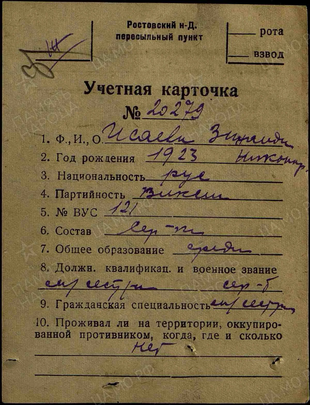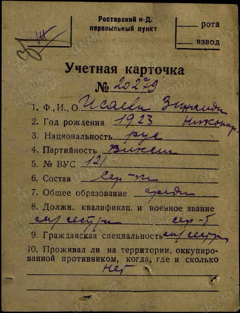 Бутенко (Исаева) Зинаида Никаноровна родилась в деревне Старая Мельница Болховского района Орловской области в 1923 году. Позднее семья переехала в Новороссийск, в 1940 году Зинаида окончила школу. В 1941 после обучения на курсах медицинских сестер работала в сортировочном эвакуационном госпитале № 4478 Военно-пересыльного пункта г. Ростов-на-Дону. По мере продвижения фронта передислоцировалась и военная часть, с 1943 года все вольнонаемные служащие стали военнообязанными. Бутенко З.Н. получила звание сержанта медицинской службы.