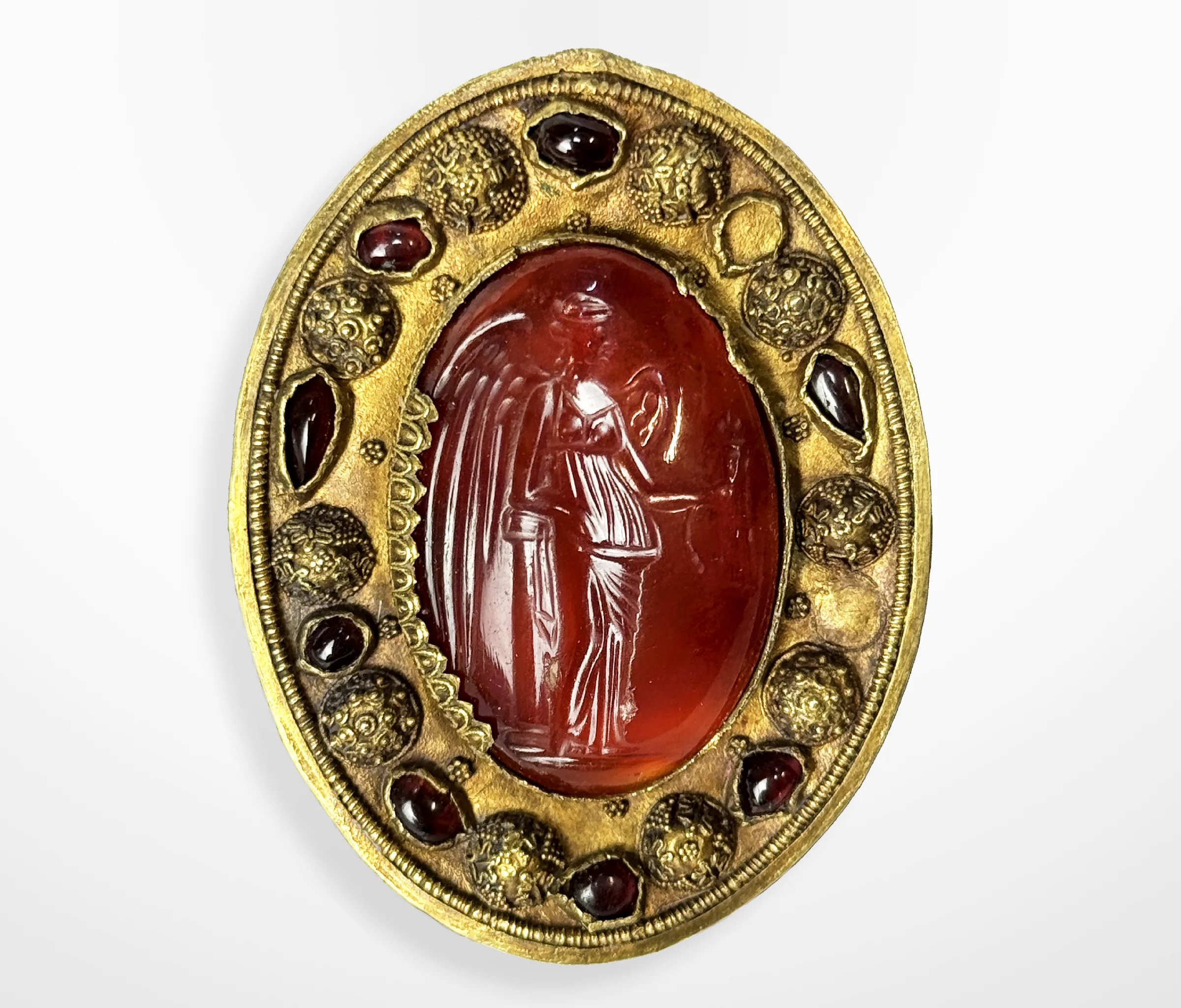 Фибула-брошь. Сер. I в. до н.э. (время изготовления - 80-е гг.) время положения в могилу - вторая половина I в. до н.э. х. Песчаный. Курган. Погребение 10. 1979 г. Размер - 6х4,5 см. Золото, сердолик, альмандин, железо. Краснодарский государственный историко-археологический музей-заповедник имени Е.Д. Фелицына.