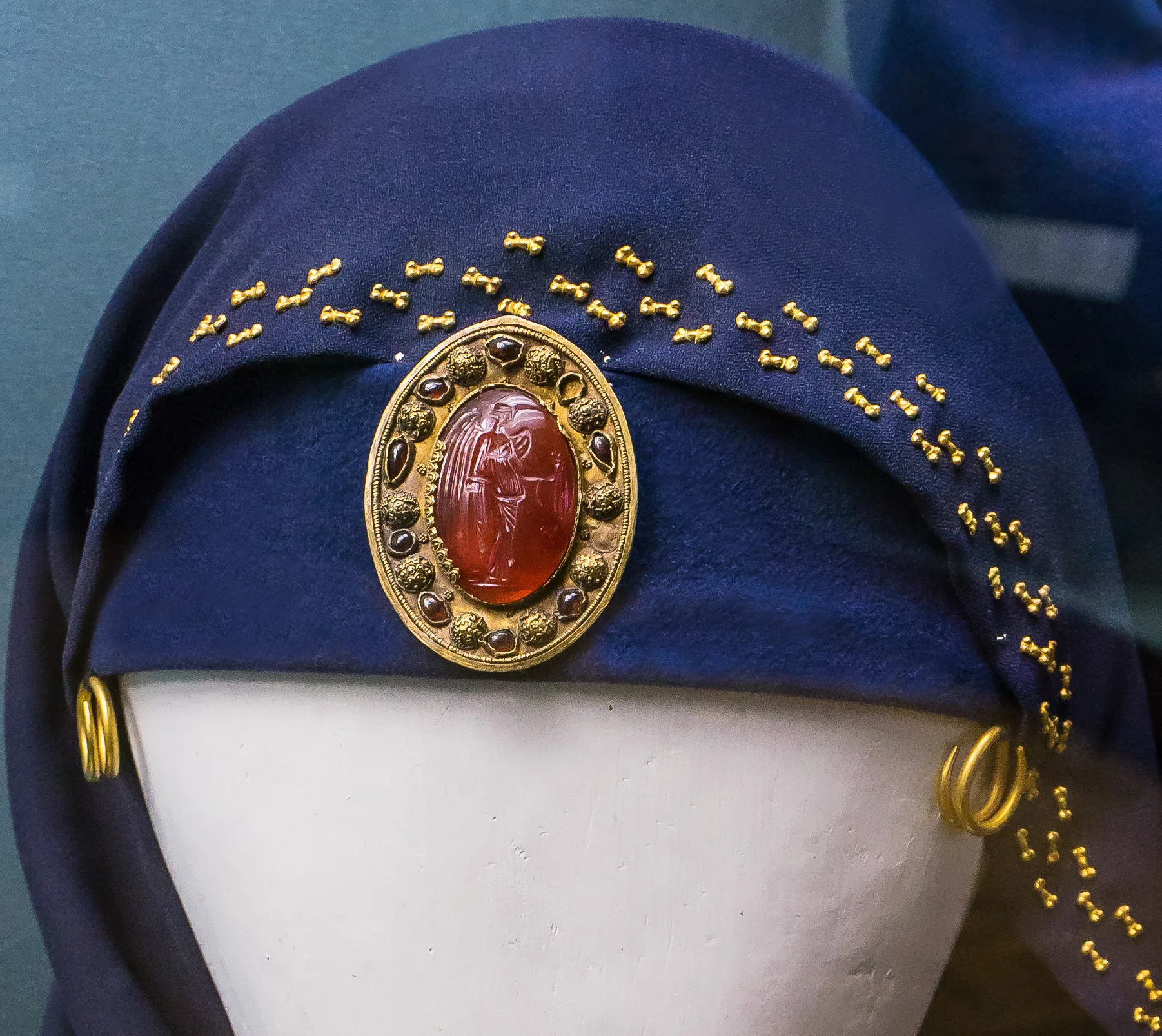 Женщина была одета с потрясающей роскошью. Её голову покрывала златотканая накидка, которую удерживала великолепная золотая брошь-фибула с изображением богини Ники – крылатой победы. Это украшение – импорт, возможно, из самой Александрии. В глубине степей, за тысячи километров от Средиземноморья, сарматская аристократка носила образ греческой богини, вплетая чужую мифологию в свой культ. У нижней челюсти и под головой были найдены височные кольца, также являвшиеся частью головного убора.