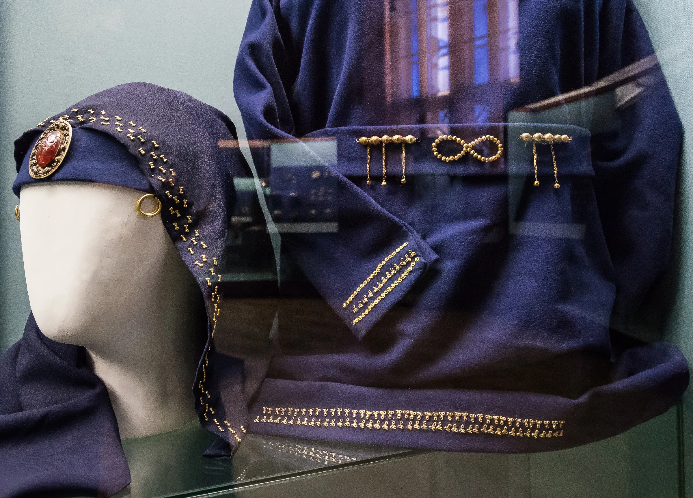 Рукава и подол платья были густо расшиты сотнями мелких золотых бляшек.