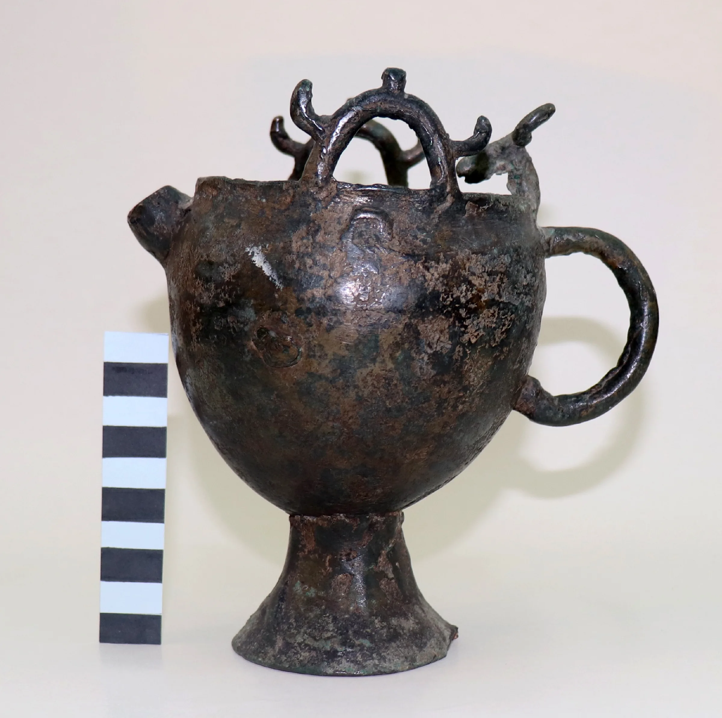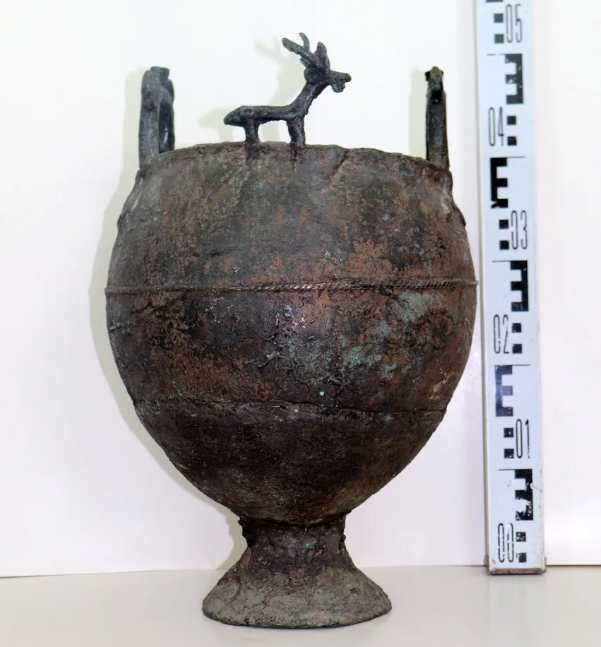Правее этих предметов лежали: большой бронзовый котел с двумя ручками и фигурками оленя на венчике; бронзовая крышка сосуда, на которой находился небольшой бронзовый котелок, украшенный головкой быка на краю. Олень служил символом небесного мира, а бык символом земли и плодородия.