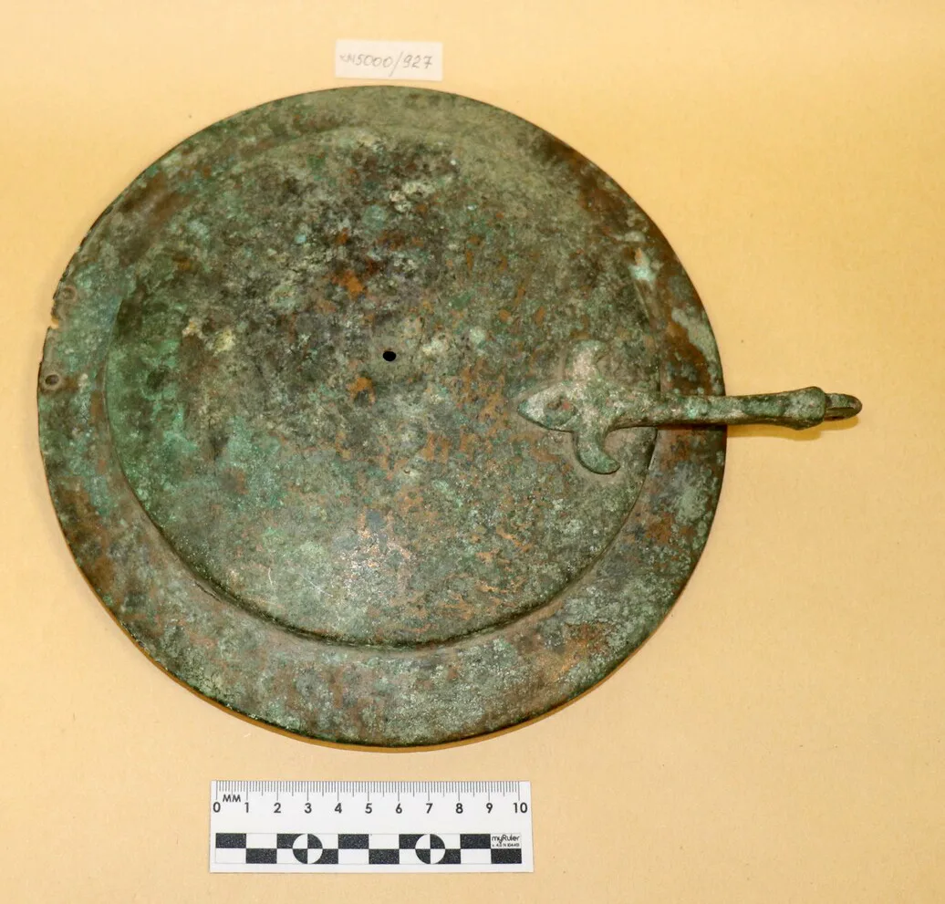 Здесь же, недалеко от голени, найдено бронзовое зеркало с остатками деревянного футляра. У кочевых народов зеркало считалось магическим предметом, способным отражать не только лицо, но и злых духов, а также служить окном в потусторонний мир. Возможно, жрица использовала его для гаданий или ритуальных очищений. Примечательно, что на зеркале лежал железный нож, сочетание этих предметов, вероятно, носило глубокий магический смысл. Там же обнаружена серебряная ложечка с головой хищника – для ритуальных возлияний, и небольшой глиняный горшочек с обрывком железной цепи. Цепь могла символизировать связь с предками или «приковывать» злые силы.