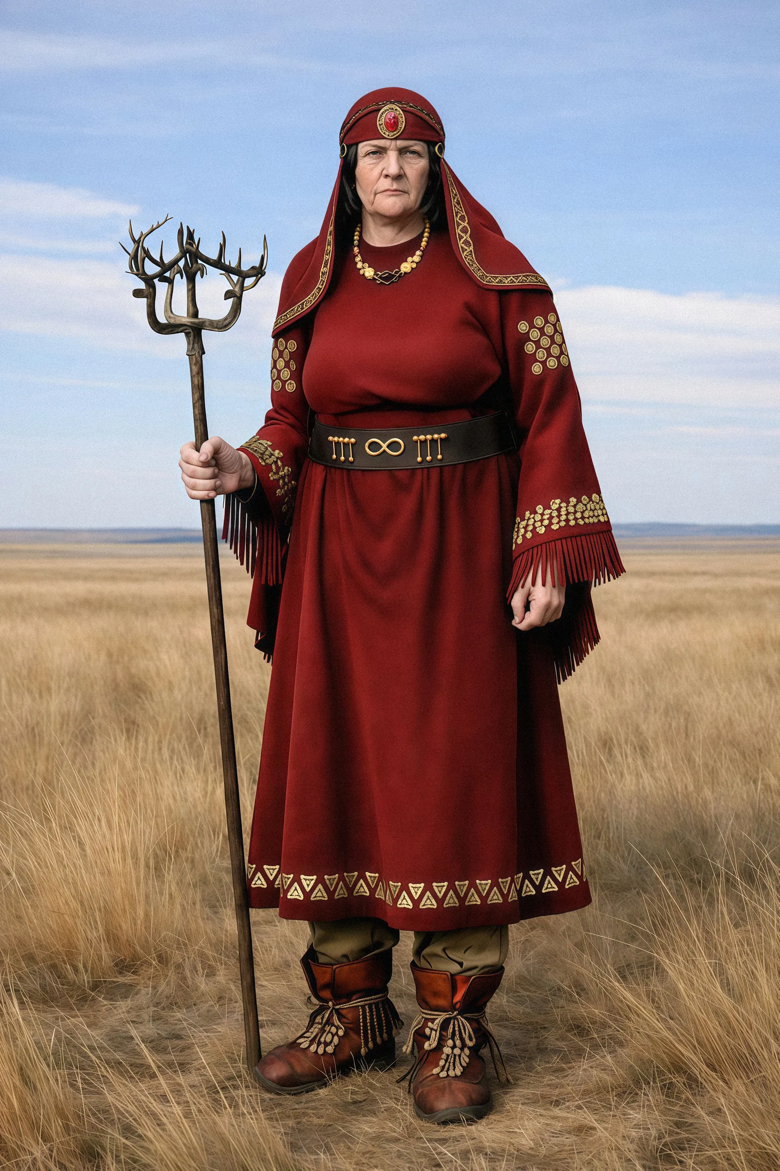 Антропологи установили, что женщине было 45–55 лет — почтенный возраст по меркам той эпохи, время мудрости и максимального авторитета среди соплеменников. Она явно не была обычной кочевницей. Её статус выдавал богатый погребальный наряд. Ритуальные инструменты, найденные в могиле, указывают на то, что перед нами жрица, хранительница священных знаний и посредница между людьми и богами. Возможно, она объединяла духовную и светскую власть, возглавляя род или племя.