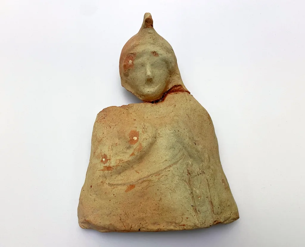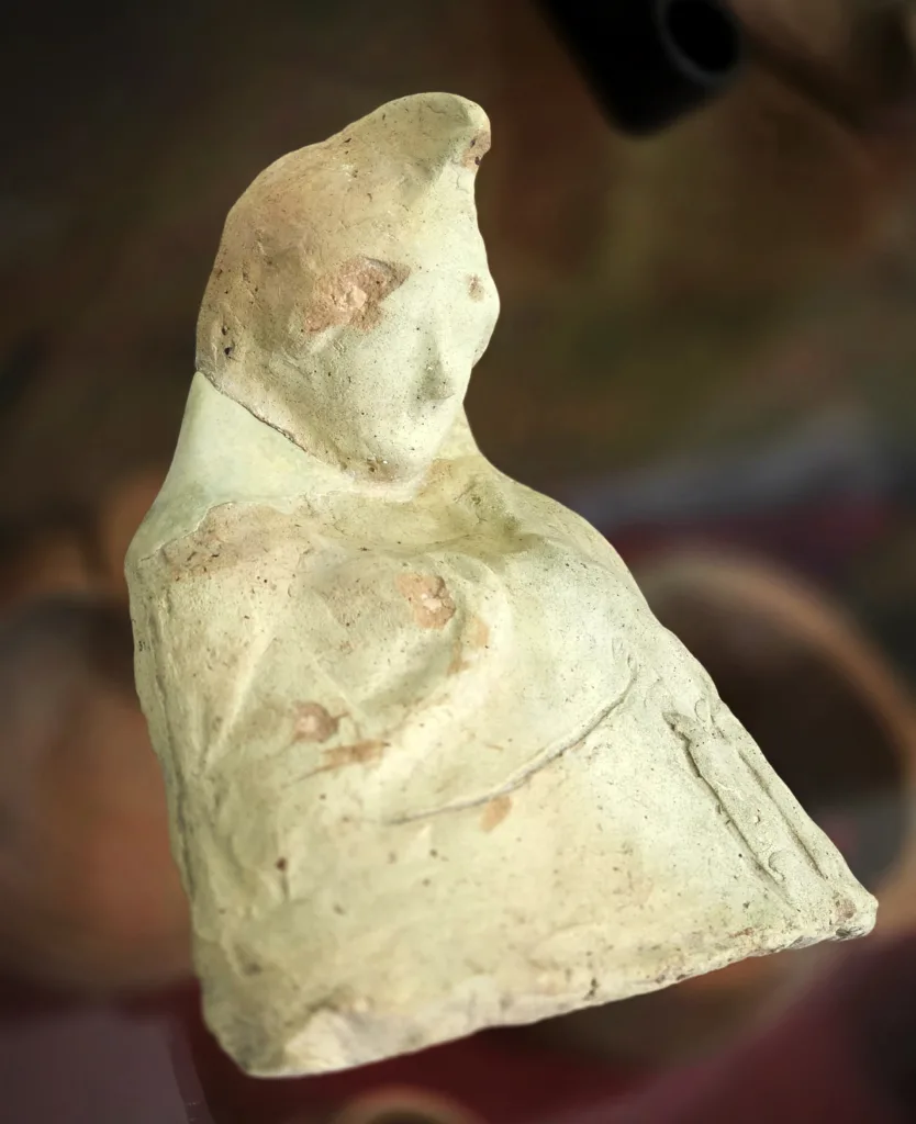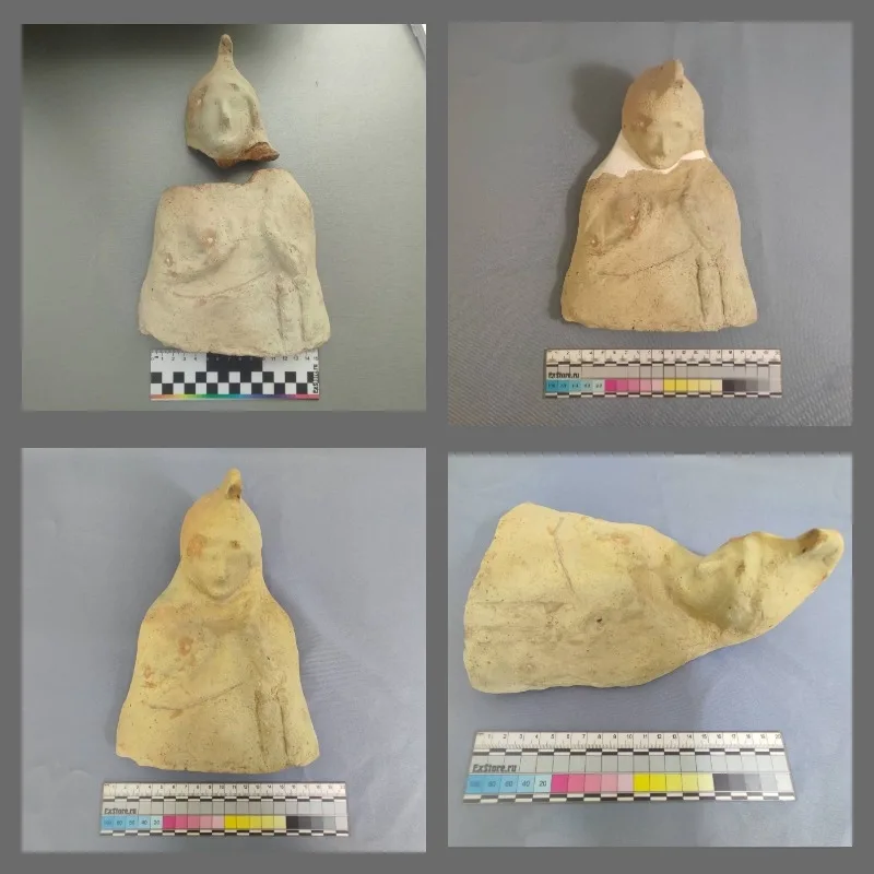 Особый интерес вызвал комплекс терракотовых статуэток, предположительно происходивших из домашнего святилища зажиточного хозяина усадьбы. Среди них выделялась крупная протома (плоское скульптурное изображение верхней части фигуры. Ширина — 17 см, высота — 24 см), изображающая богиню по пояс. Её образ полон символики и благоговения: руки скрещены на груди и придерживают накидку, голова смиренно склонена вперед. Голову богини венчает фригийский колпак — высокий конический головной убор, из-под которого выбиваются пряди волос. Эта деталь, наряду с общей иконографией, позволила ученым датировать находку III-II веками до н. э. и определить её суть.