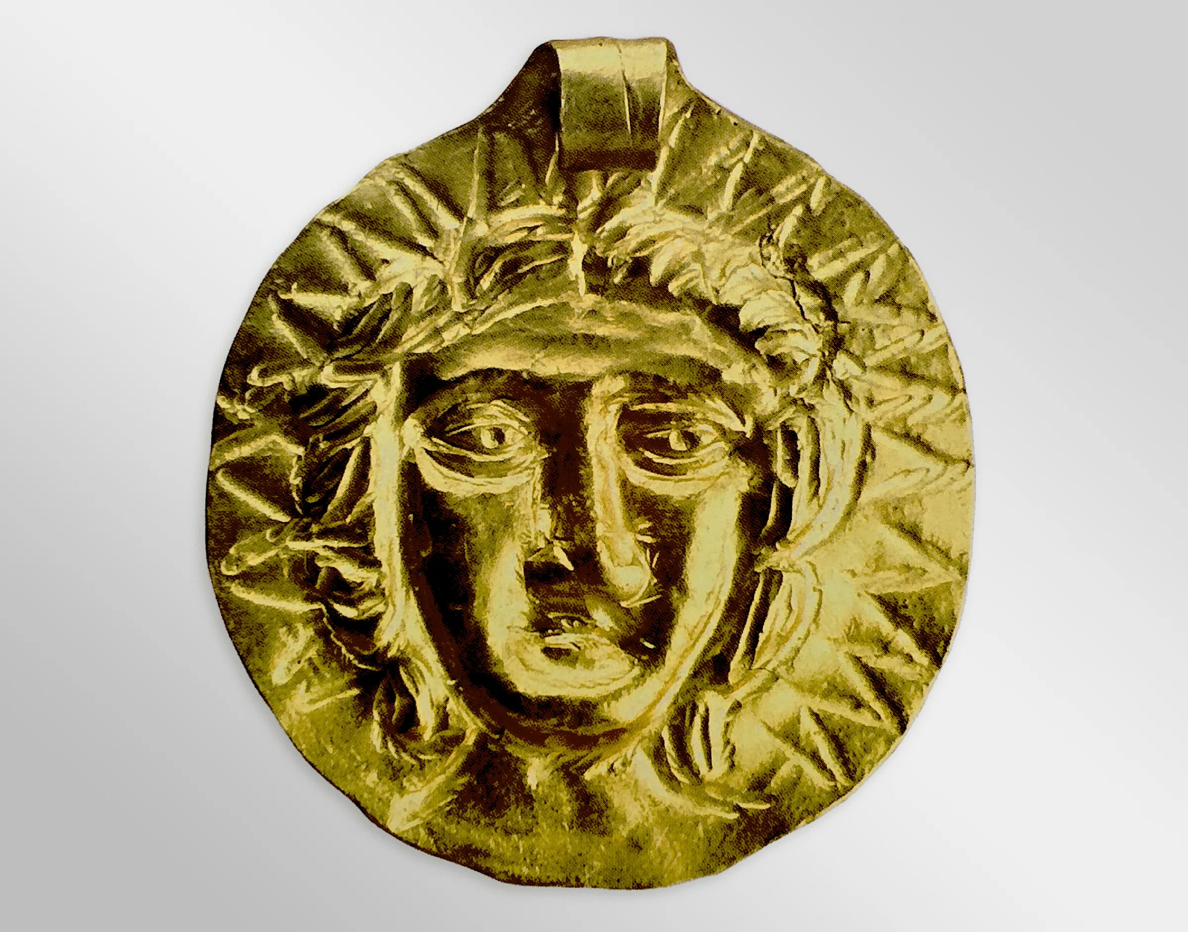 Золотой медальон (диаметр 2,5 см) с рельефным изображением мужского лика в обрамлении лучей. Учёные отождествляют это изображение с богом солнца Гелиосом, что свидетельствует о влиянии эллинистической культуры на сарматскую знать Прикубанья.