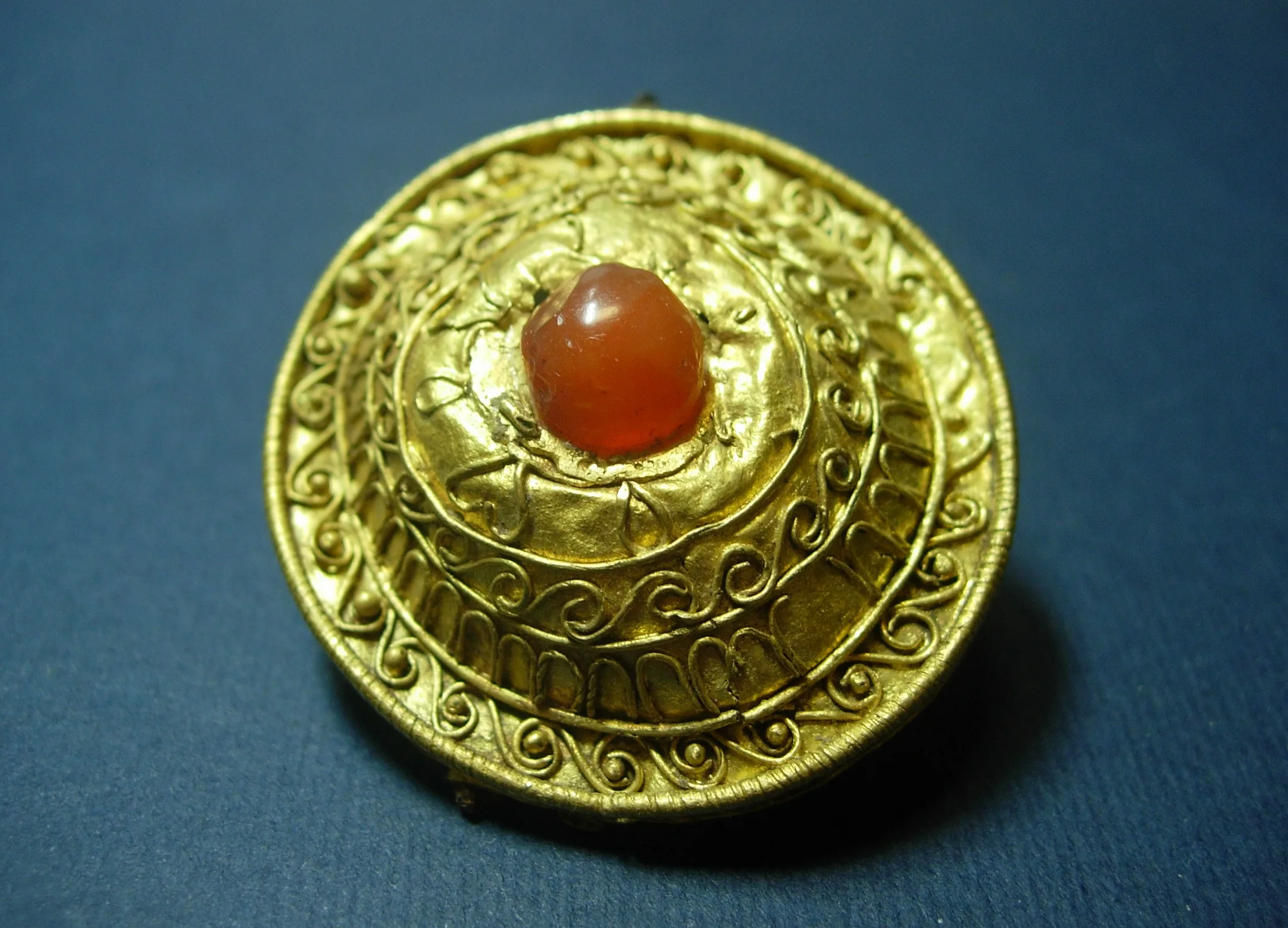 Золотая фибула-брошь (диаметр 4,2 см) сложной работы – настоящий шедевр древнего ювелирного искусства. Полусферический щиток украшен концентрическими поясами из изящной филиграни (листья аканфа, волюты, овы) и инкрустирован сердоликом. Находилась в области верхней части груди, с правой стороны.